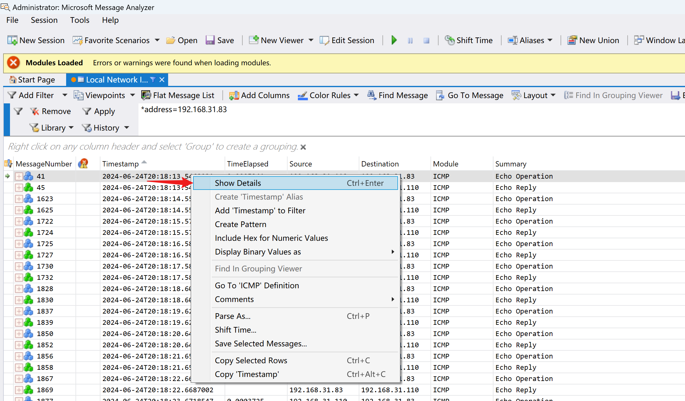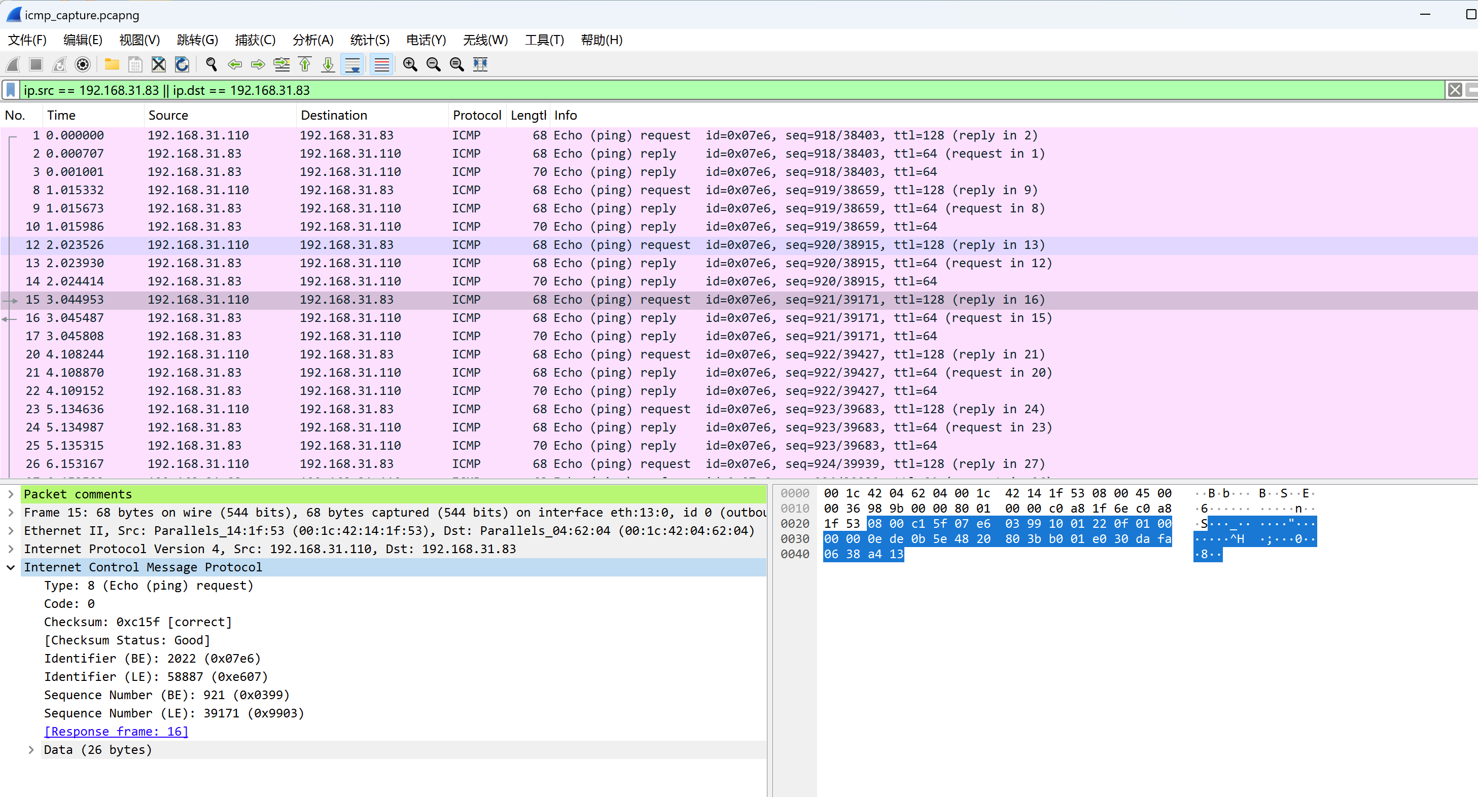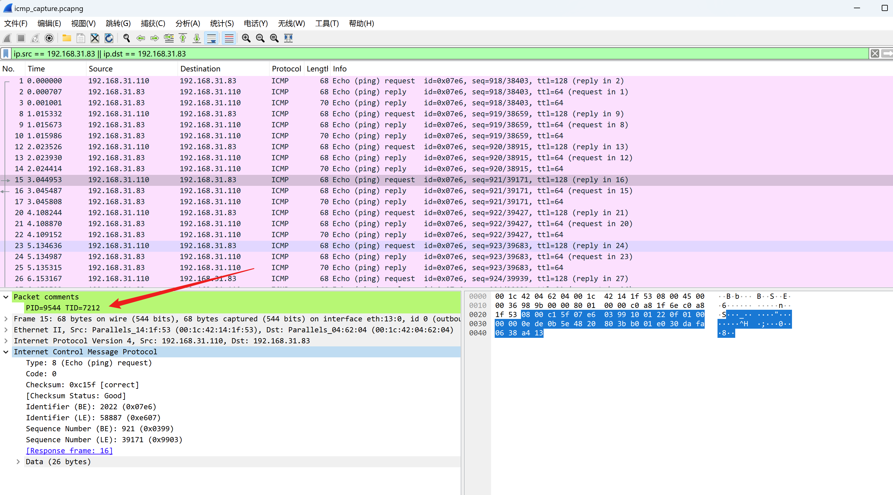 默认好像看不出什么,就是分析了 ICMP 数据包,我们点击上方的 Tools 调出其他 details 界面